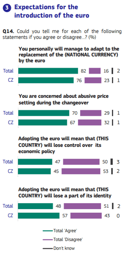 I přes nárůst popularity jsou ale Češi k euru stále skeptičtí. Například 57 % obyvatel zastává názor, že adaptováním evropské měny bychom ztratili část naší národní identity. Zároveň 67 % dotázaných se obává nárůstu cen, které by přijetí mohlo způsobit. Asi 29 % Čechů si myslí, že euro náš stát nikdy nepřijme.