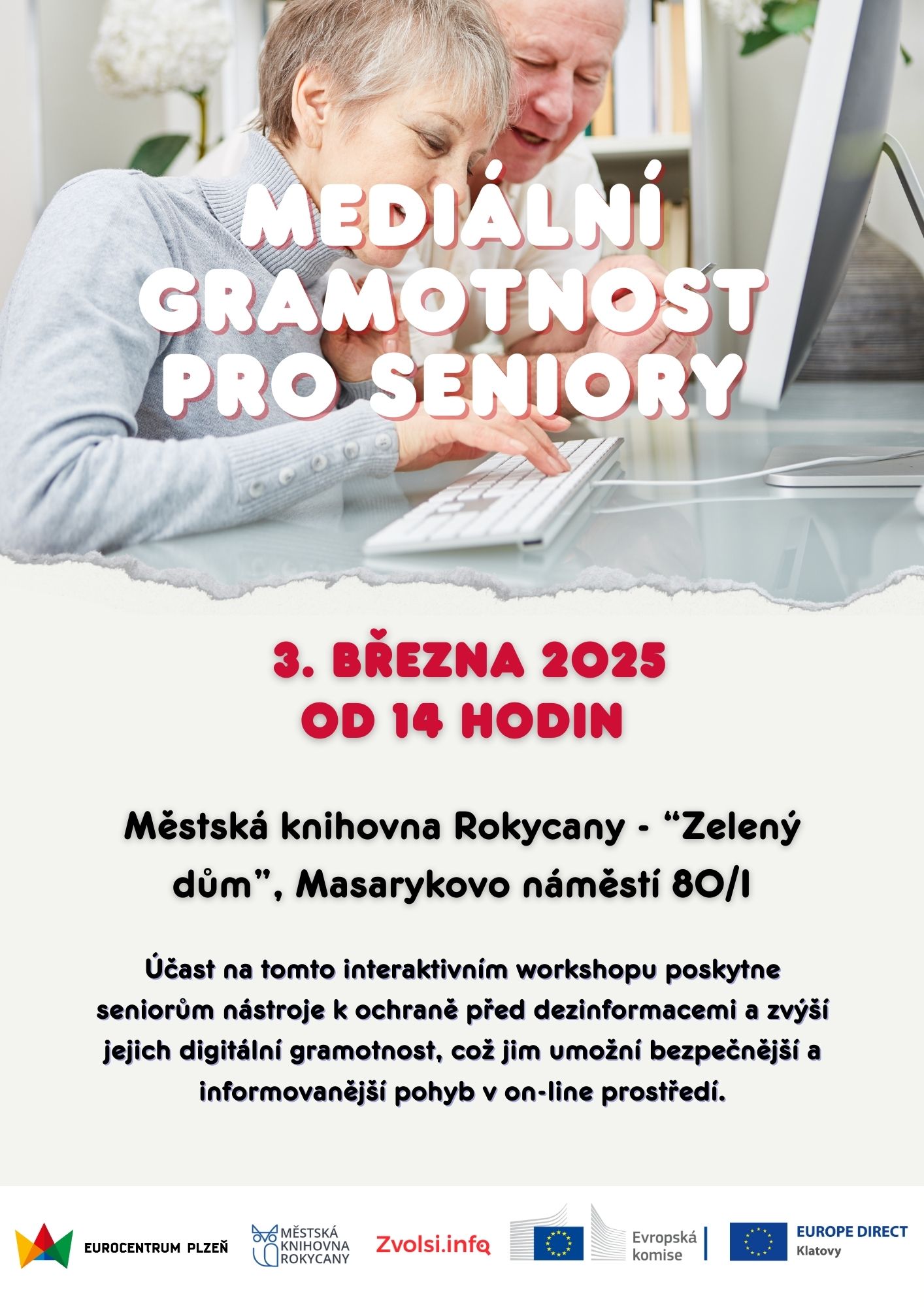 Eurocentrum Plzeň zve všechny zájemce z řad seniorů na praktický workshop, který se uskuteční dne 3. března 2025 od 14 hodin v prostorách „Zeleného domu“ Městské knihovny Rokycany.