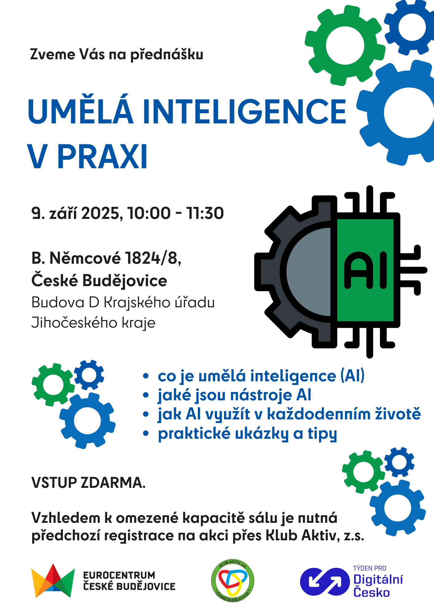 S ohledem na omezenou kapacitu sálu je nutná předchozí registrace, a to přes Klub Aktiv, z.s.