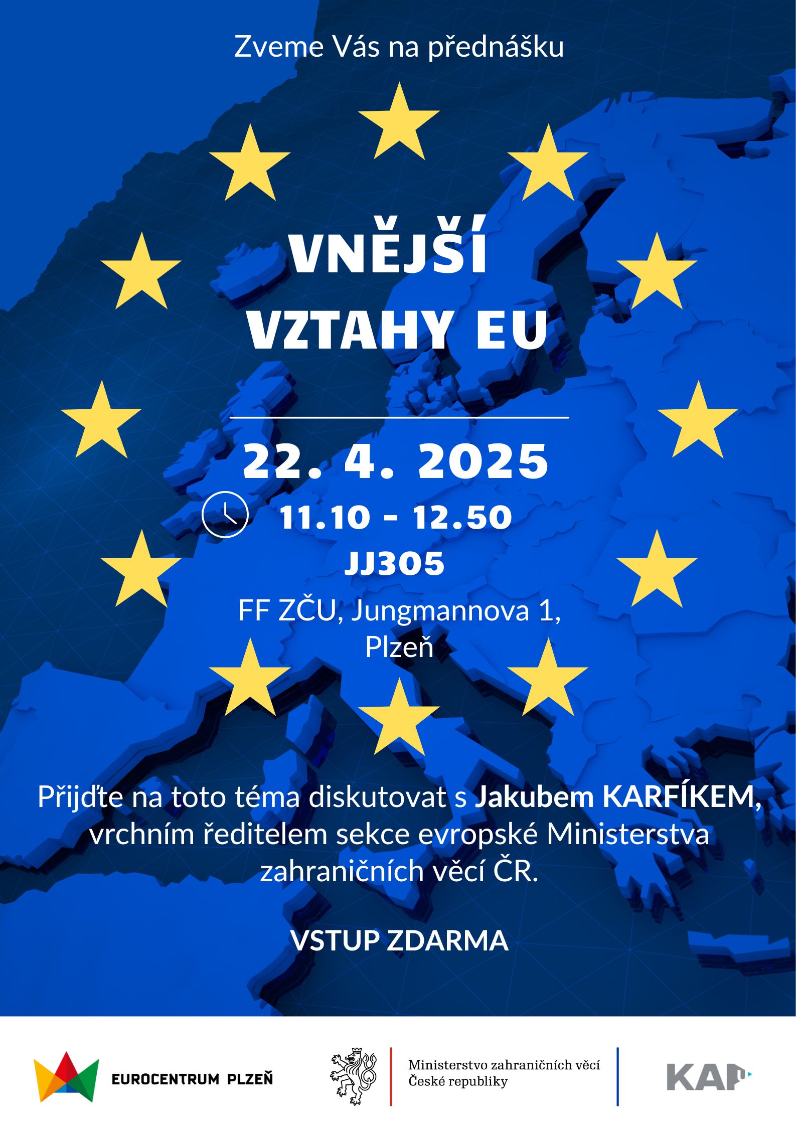 Eurocentrum Plzeň zve všechny zájemce na besedu Vnější vztahy EU, která se uskuteční dne 22. dubna od 11.10 do 12.50 hodin na Fakultě filozofické ZČU, Jungmannova 1, v místnosti JJ-305.
