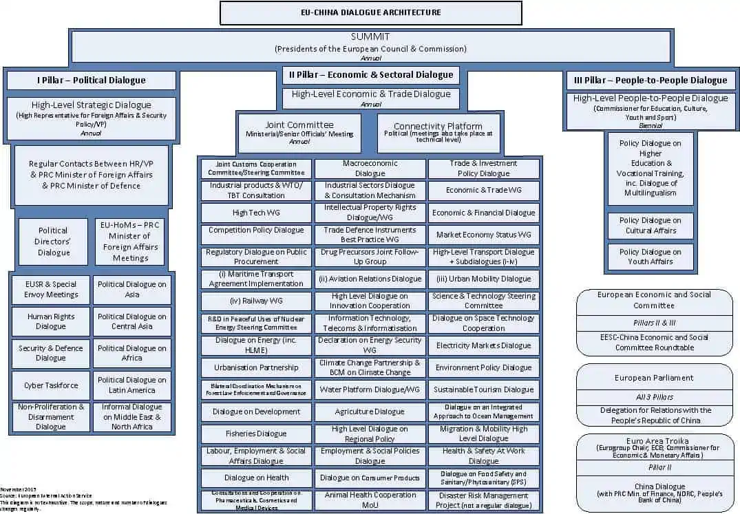 V roce 1998 se zároveň v Londýně uskutečnil první summit EU – Čína. Summit byl až do roku 2010 pořádán na každoroční bázi. na multilaterální úrovni spolupracují Čína a EU v rámci Asijsko-evropských setkání ASEM, a taktéž na summitech skupiny zemí G20.