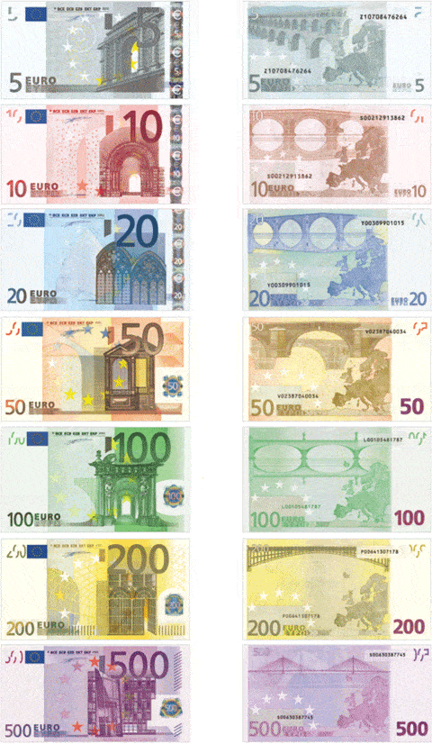 Eurobankovky mají sedm nominálních hodnot – 5, 10, 20, 50, 100, 200 a 500 E, které se odlišují velikostí a barvou.