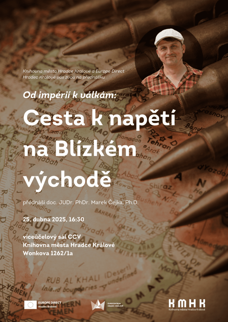 Eurocentrum Hradec Králové Vás zve na přednášku doc. Marka Čejky na téma souvislostí vývoje regionu Blízkého východu, které vedly k současné napjaté situaci. Odborník na Blízký východ s dlouholetými zkušenostmi z této oblasti představí své poznatky a analýzy, včetně aktuálních témat izraelsko-palestinského konfliktu.