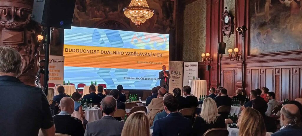 Odpolední část pokračovala přednáškami o aktivitách Moravskoslezského paktu zaměstnanosti zejména směrem k návrhu změny legislativy odborného školství a souhrnnou informací o výsledcích pilotního zavádění prvků duálního vzdělávání v kraji ze strany Krajské hospodářské komory Karlovarského kraje. v široké panelové diskusi zástupců krajských středních škol a významných zaměstnavatelů zazněla řada podnětů k začlenění praxe do vzdělávání i problémy s tím spojených. Zástupci Západočeské univerzity v Plzni nakonec představili, jak realizují duální systém ve vysokoškolském studiu.