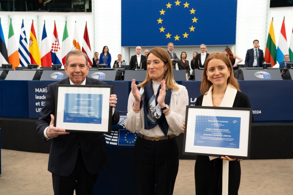 Lídři venezuelské opozice María Corina Machado a Edmundo González Urrutia dnes ve Štrasburku od předsedkyně Evropského parlamentu Roberty Metsoly převzali Sacharovovu cenu za svobodu myšlení. González tak učinil osobně, Machado zastoupila její dcera Ana Corina Sosa. González cenu přijal se slovy „Ať žije svobodná Venezuela“, zatímco Machado při videopřenosu prohlásila, že oba vůdci cenu přijímají jménem celého venezuelského lidu a že režim autoritářského prezidenta Nicólase Madura se dopouští agrese proti vlastním lidem.
