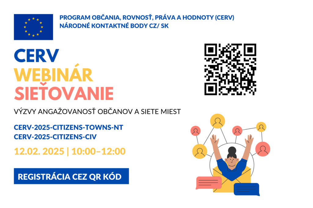 Ve středu 12. února 2025 proběhne online webinář k otevřeným výzvám programu CERV, zaměřený na výzvy Sítě městAngažovanost občanů. Akci pořádá Národní kontaktní místo CERV Česká republika ve spolupráci s Národním kontaktním místem CERV Slovensko. Registrace je otevřena pro všechny zájemce do 7. února 2025.