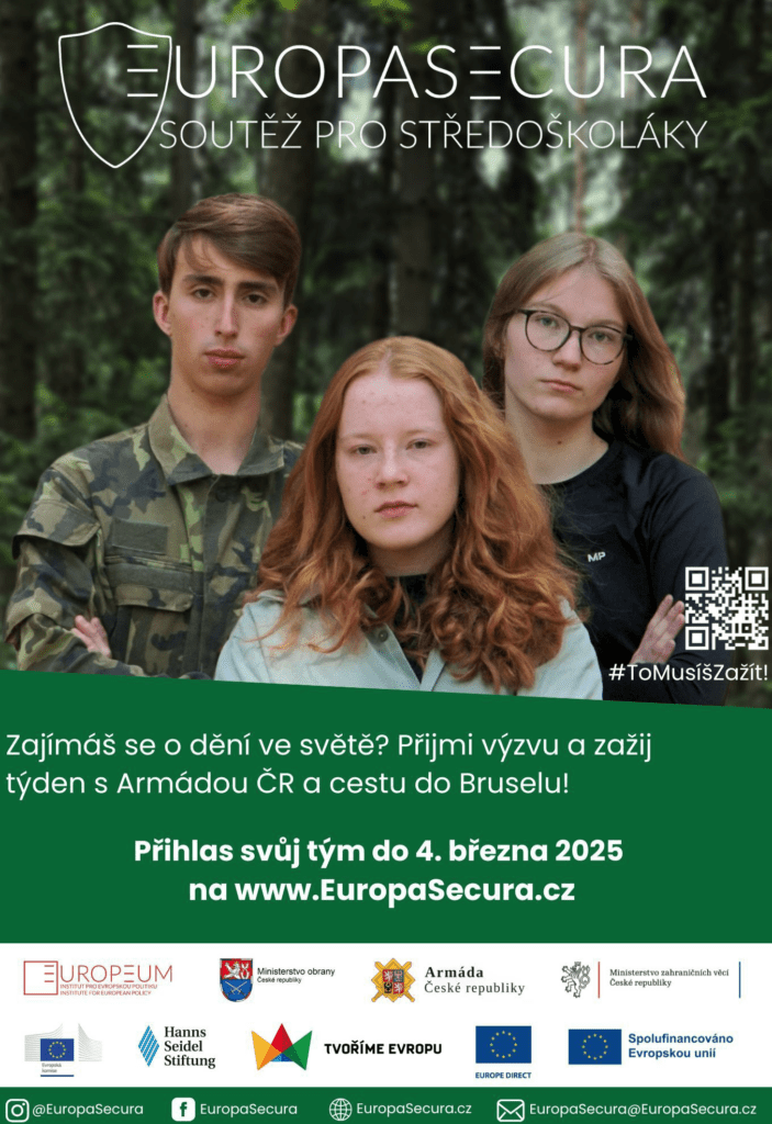Sestavte tříčlenný tým a zapojte se do unikátní několika kolové soutěže. Otestujte si své znalosti ve vědomostním testu, vžijte se do role expertů a expertek na bezpečnost a zažijte nezapomenutelný týdenní workshop s Armádou ČR a odborníky a odbornicemi na mezinárodní politiku. Vítězný tým získá plně hrazenou exkurzi do Bruselu. Soutěžíme od března do září 2025. Díky dlouhodobé podpoře partnerů soutěže jsme schopni proplatit všechny náklady spojené s účastí, soutěž je tak otevřena všem.
