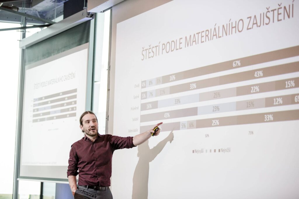 Potom jsou spíše psychologické experimenty, které měří štěstí jako aktuální časový moment. To se například realizuje tak, že se zapojíte do výzkumu, kde máte aplikaci, ta vám pípne a vy v tu chvíli řeknete, zda jste spokojený nebo ne. Potom to reflektujeme s těmi lidmi. Co se dělo v momentě, kdy během 10 dnů z těch 50 hodnocení jste třikrát byli nespokojení? Co se v tu chvíli dělo? Jedná se o pocit okamžitého štěstí. To štěstí je nedosažitelná meta, o které máme z románů nebo filmů pocit, že to je to, co máme prožívat. ale ve skutečnosti štěstí prožíváme spíše dlouhodobě a vnitřně. My potom sledujeme jaký vliv na to má pocit osamělosti, ekonomická situace nebo zdraví. Je velmi zajímavé, že naštěstí má větší vliv to, že se cítíme osamělí, nežli zda jsme chudí nebo bohatí. a v tom je i ta krása sociologie, kdy oproti tomu, že často máme z médií dojem, že jde o peníze, tak o peníze sice jde, ale ne v první řadě.