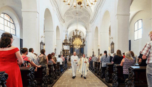 Pohled do kostela Nanebevzetí Panny Marie v Plasích na Plzeňsku, který se 14. srpna 2021 po více než tříleté opravě otevřel veřejnosti. Mimořádná, původně románská stavba, je nejstarší v areálu bývalého kláštera. Zdroj: ČTK