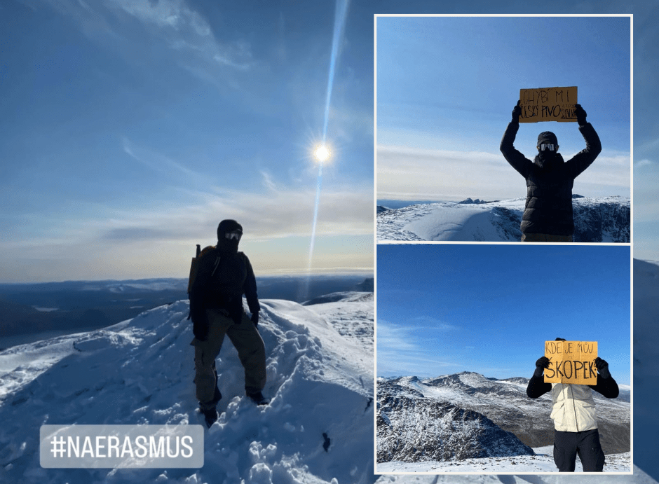 „Na Študijný Erasmus+ pobyt som na zimný semester vycestovala do krásneho Nórska. Moja univerzita sídli v krásnom mestečku Hamar pri rieke Myosa. Nórsko je krásna krajina či už vďaka typickej severskej architektúre, no hlavne vďaka prírode. Celý môj pobyt sa nesie v duchu poznávania a cestova. Prešla som niekoľko krásnych miest a vyšlapala množstvo krásnych a vysokých kopcov. Mala som veľký problém vybrať jednu fotku pretože za posledné mesiace mám plnú galériu dychberúcich scenérií, preto posielam koláž dvoch. Prvá je niečim špeciálna. Ukazuje všetky krásy tejto krajiny. Sneh, zima, výhľad a aj pocit sebauspokojenia po zdolani vrchu Rasletinden, 2105 m.n.m.